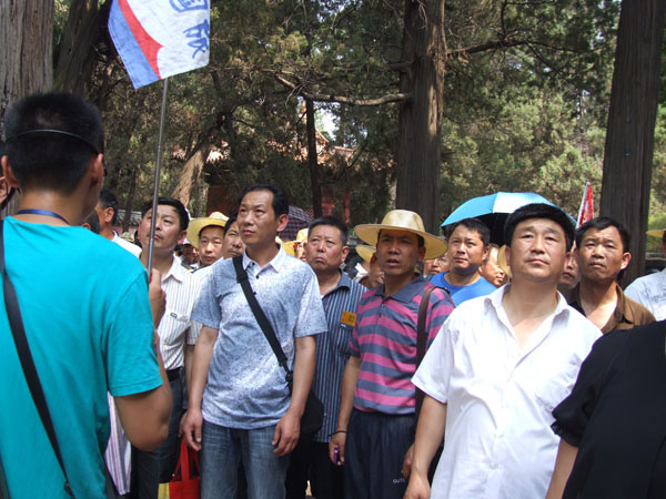 黨員們?cè)趯?dǎo)游的帶領(lǐng)下首先參觀了世界文化遺產(chǎn)“三孔”——孔廟、孔府、孔林,觀看了奎文閣、十三碑亭、杏壇、大成殿等標(biāo)志建筑。整個(gè)孔府孔廟遍植成行的松柏,濃蔭蔽日,創(chuàng)造出清心滌念的環(huán)境,而高聳挺拔的蒼檜古柏間辟出一條幽深的通道,使我們深深的感到其歷史的悠久和孔子思想的博大精深。 24日清晨,大家乘車來(lái)到中天門開(kāi)始登泰山,看迎客松,走龍門,過(guò)升仙坊,登十八盤,至元忽必烈始建的南天門,逛天街,游碧霞祠。在這座歷史名山中,深深的感受到了孔子“登泰山而小天下”的贊嘆,登上玉皇頂,更是體會(huì)到杜甫“會(huì)當(dāng)凌絕頂,一覽眾山小”的千古絕唱。從中天門到南天門的登山過(guò)程中,黨員們進(jìn)行了登山比賽,大家?jiàn)^勇?tīng)?zhēng)先,最后畢國(guó)志獲得了登山比賽的第一名,王文圣獲得第二名,叢樹(shù)成、夏民清同時(shí)到達(dá)南天門并列第三名。